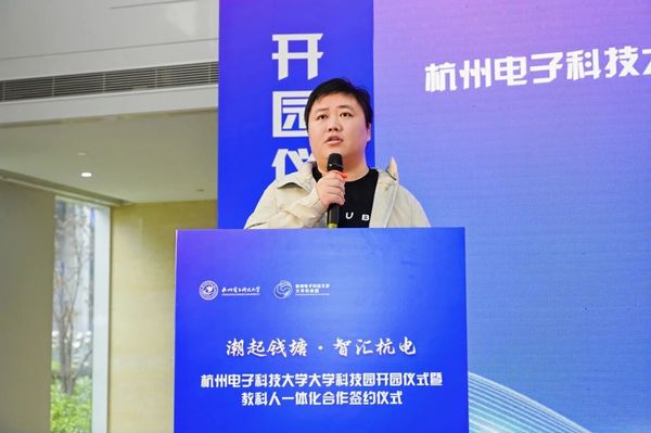 更让我自豪的是,我们正和母校共同承担国家重点研发计划,联合申请并授权了两项发明专利。未来,我们将深度融入杭电大学科技园发展,将在园区设立联合创新实验室等创新载体,推动关键技术协同攻关;依托钱塘区产业优势,加快科技成果在钱塘区转化落地;同时启动“杭电实习生培育计划”,每年开放岗位,优先录用母校学子,助力更多青年人才成长。
