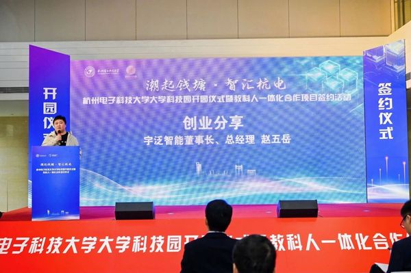 作为从杭电走出的优秀创业者代表,电子信息学院2008级校友、宇泛智能创始人、董事长赵五岳随后在现场发言,分享了母校支持对其创办企业的关键作用,讲述了自身的创业历程与感悟。