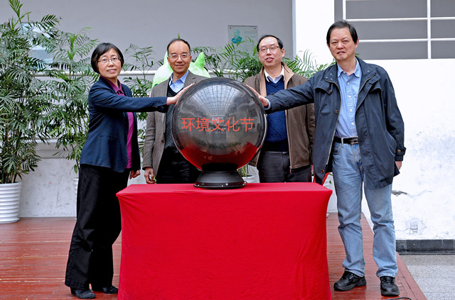 校领导费君清、陈畴镛、冯浩、孙玲玲一起开启启动球,为第八届环境文化节和杭电十景揭幕