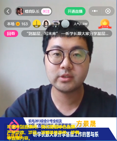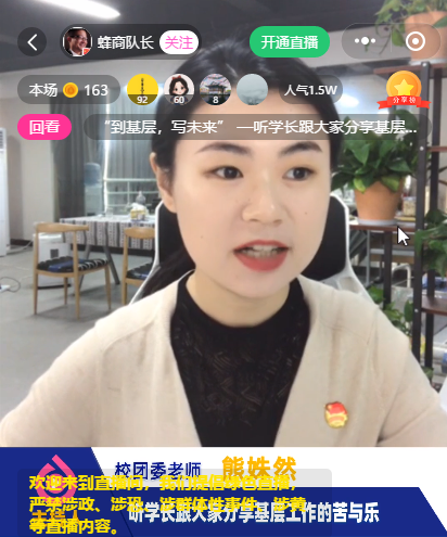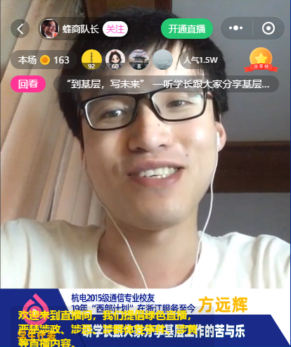 在提问环节,2016级人文学院毕业生、2020年“西部计划”参与者何炜,2016级自动化学院毕业生、2020年“西部计划”参与者王云鹏,2016级经济学院毕业生、2020年“西部计划”参与者张盼分别就“如何融入到基层团队”、“如何融入到当地群众”、“和当地人交流需要注意什么”等问题同嘉宾们进行了交流和讨论。我校师生校友共计1.5万人次观看了现场直播。