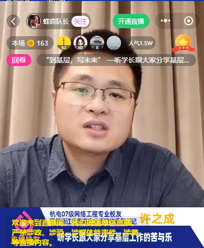 围绕本期毕业季最后一讲主题“到基层,写未来”,许之成校友通过分享自己毕业近十年来从省市到乡村“往下走”的学习和工作经历,讲述了基层踏踏实实,平淡无奇的工作所包含的“苦”与“乐”、收获的成长与感悟。他说,在杭电学习的四年是自己学习生涯中最快乐的一段经历。在校读计算机网络工程专业的他,曾任班长和社团负责人,毕业后创办过公司,在多家大型企业工作过,也曾继续深造获得了杭电MBA学历。但是,最终他发现自己适合体制内的工作。考上公务员后,从省市来到乡村,半路出家的基层工作让他深感“事情杂、压力大、条件差”的“苦”,同时也悟出了基层工作的收获和快乐恰恰来源于此。“事情杂”正好可以锻炼自己处理各项业务的统筹能力;“压力大”则可以磨炼自己应对各种突发事件的抗压能力;而“条件差”则是对自己全心全意为人民服务宗旨和初心的考验和吃苦耐劳品质的培养。当帮助当地人民群众解决实际问题后,群众对党和政府的感激之情溢于言表,作为基层工作者,那份由衷的骄傲和快乐是许之成这辈子所无法忘记的。他认为,基层工作是最能“去除杂质、去娇气、接地气”的地方,只要愿意虚心向群众学习,不怕犯错,一定能收获成长;基层工作也是最能获得机会的地方,只要不忘初心,牢记使命,“起步低、平台少”的基层工作同样能锻炼并成就像习总书记这样的领导干部。最后,许之成寄语刚毕业的学弟学妹,基层工作要“多学、多做、多想”。除了向群众学习,也要向书本学习,要多种途径提高自身素质;要做好吃苦准备,成长就如同爬山,累意味着离山顶越来越近,离成功越来越近;要多思考、多总结,转换思维方式,将经验转化为工作方法。在全面建成小康社会的关键之年,作为“后浪”的基层工作者就像一颗颗“不可缺少的螺丝钉”,必将为国家和社会做出自己应有的贡献!