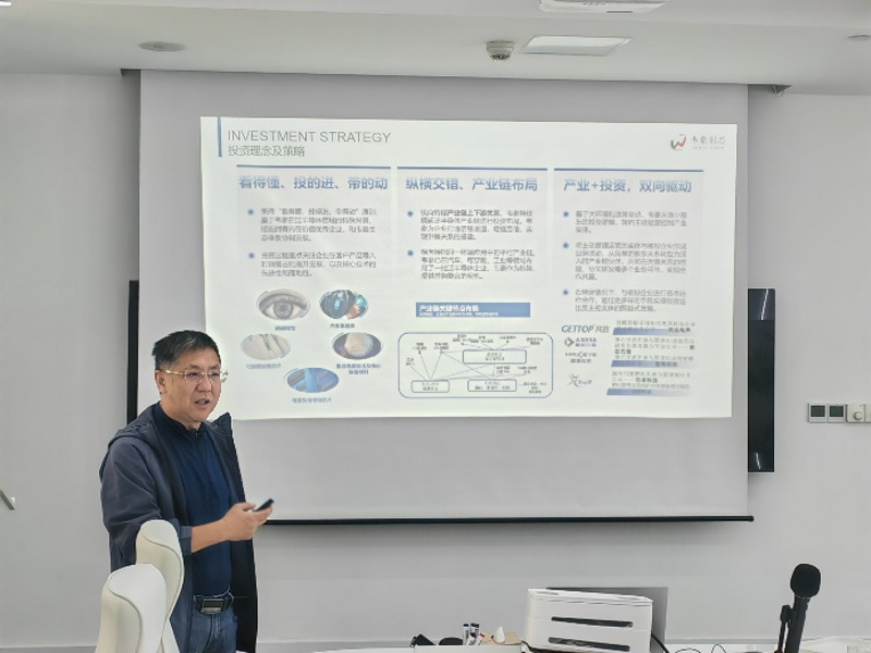 在上海韦豪创芯投资管理有限公司,杭电92级校友、公司董事长兼总裁周思远向学校领导和校友代表们分享了公司在泛半导体领域的投资布局和发展成果。