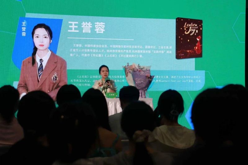 师生们见证了由中国作家协会会员、中国网络作家村党支部书记、外国语学院2010级英语专业校友王誉蓉创作的《上元欢》英译精装版Lantern Festival Joy的内容发布,同时倾听了校友王誉蓉“宋韵文化创作及文化出海心得”主题分享。王誉蓉介绍了创作背后的成长故事并在分享中强调英语专业学习的重要性,鼓励同学们用好语言的工具,勇于面对生活中的挑战。互动环节中,学生代表向校友奉上鲜花,幸运读者获赠作者签名新书并与作者合影留念。